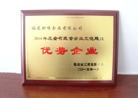 熱烈祝賀“福建新味食品有限公司”被福建省工商業(yè)聯(lián)合會(huì)評(píng)為“2014年度全省民營(yíng)企業(yè)文化建設(shè)優(yōu)勢(shì)企業(yè)”稱(chēng)號(hào)。
